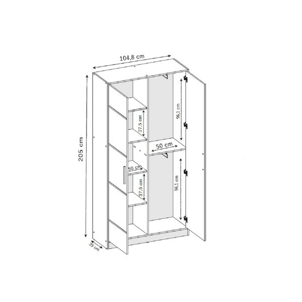This practical wardrobe is the perfect solution for hallways or bedrooms where space-saving is essential. With its timeless design, it effortlessly fits into any interior and offers both a practical and stylish storage solution. The wardrobe is made of high-quality laminated chipboard with a thickness of 16 mm, and its edges are reinforced with durable PVC material to ensure long-lasting durability.A particular highlight is the "Push To Open" system, which allows for simple, handle-free operation and contributes to a modern appearance. The four mirrors, mounted on a black panel, add an elegant touch to the wardrobe and create the illusion of a larger space. The black base and high-quality fittings promise long-lasting performance and reliable functionality.Equipped with extendable clothes rails, this wardrobe offers a flexible way to keep your clothing neat and accessible. Delivered as a self-assembly unit, it is a premium piece of furniture made in Poland that is not only functional but also a real eye-catcher. Ideal for any space that combines modern elegance with practical storage.