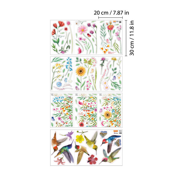 Our Huge Hummingbird with Watercolour Wildflower Meadow Windows Clings are double-sided printed so that you can see the image from both sides of the window. They also great as party decorations, can be applied to windows, doors, floor, fridge, glasses, bathroom, home appliance, air-condition, office, dorm, or retail store. Our clings are without glue, and you can reuse them how many times you want! To install, make sure the surface is clean and smooth, spray a little water on the window to paste it better. To help to prevent the collisons, apply the elements not far from 10cm or 4 inch of each other. Easy and convenient to remove without damaging the glass. Each packaging contains 12 sheets of 30 x 20 cm or 11.8 x 7.8 inch, with 98 clings in total. Finishing size: 105 x 91 cm or 41.5 x 35.8 inches.