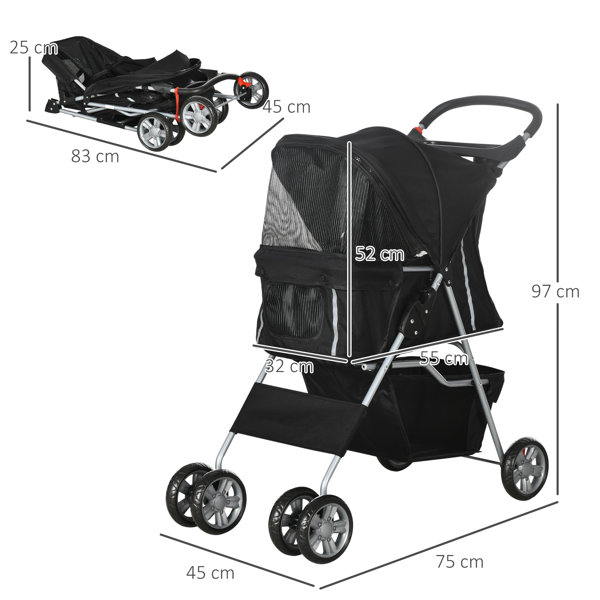 Dog buggy is a relatively new concept that has continuously increased in popularity since its introduction. What started as a way for over-protective owners to express just how over-pampered their pets have quickly grown to become a practical and helpful addition to any pet-friendly household. Today, many pet lovers swear by them and the benefits that they offer. This pet pram provides a viable form of transportation for sick or elderly animals. Solid construction with steel frame and Oxford cloth, make this stroller sturdy for long-lasting use. Front universal wheels and two rear wheels with brake included for easy parking. Safety leash inside to keep your pet securely strapped in- 3 mesh windows for good air circulation and better visibility. Bottom storage compartment and cup holder for easy access to pet supplies and personal belongings. Foldable design for easy storage and transport. 2 Pairs of reflective strips included for added safety. Handle is covered with EVA foam for grip and comfort. Suitable for small and miniature dogs less than 35 cm in length and less than 10 kg in weight. Assembly required. Material: Steel pipe, Oxford cloth. Product size: 75L x 45W x 97Hcm. Weight capacity: 15kg. Inner space dimension: 55L x 32W x 52Hcm. Folded dimension: 83L x 45W x 25Hcm.