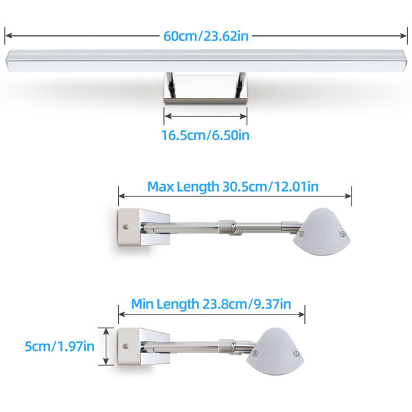 【Detailed Parameters】Stainless steel material and Acrylic lampshade,600mm*(240-310)mm*50mm,960 lm,Chrome + fog silver finish. 3000K warm white,CRI 90 makes the light more gentle and perfectly illuminating your painting.